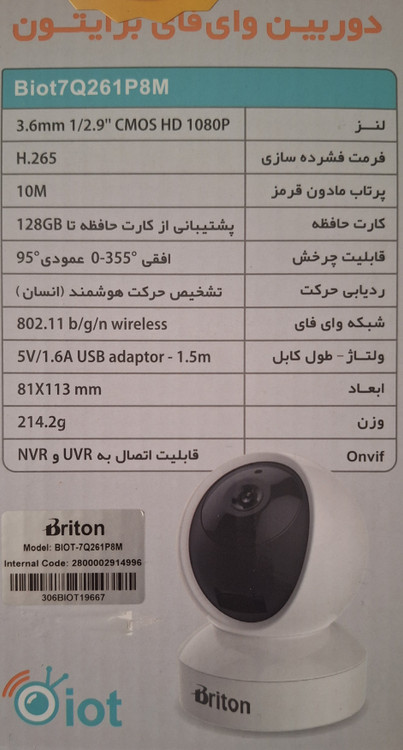 یک دوربین فوق العاده برای نظارت بر اتاق سالمندان و کودکان و انواع استفاده دیگر .دوربین وای فای برایتون IOT7Q261P8 یک دوربین وای فای 2 مگاپیکسلی که با استفاده نرم افزار Briton IOT یا B IOT و Briton CCTV Pro به اینترنت متصل می شود و شما می توانید در هر مکان و زمانی تصاویر آن را با استفاده موبایل خود دریافت کنید. همچنین در این دوربین از تکنولوژی ردیابی حرکتی ( تعقیب سوژه ) نیز استفاده شده است. برد IR این دوربین 10 متر است و قابلیت اتصال SD Card تا سقف 128GB را دارد. فرمت فشرده سازی این دوربین H.265 است. این دوربین قابلتی مکالمه دو طرفه دارد. به راحتی از طریق نرم افزار می توانید با فرد مقابل دوربین بیبی کم مکالمه داشته باشید.
